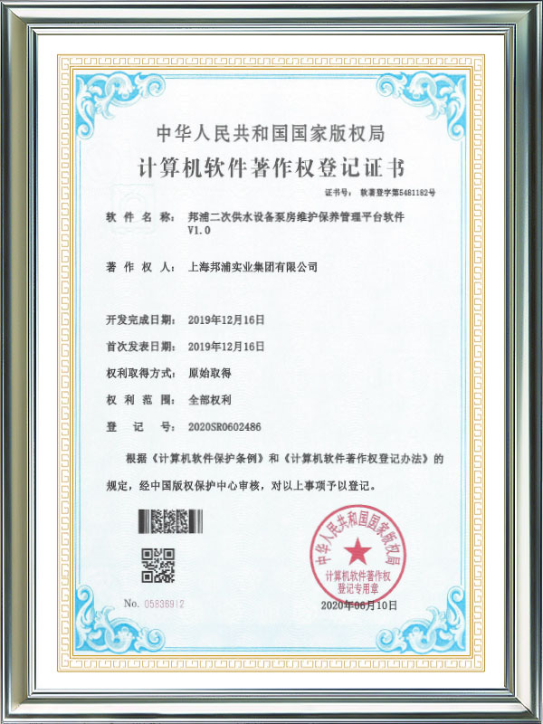 Software de calculator Certificat de înregistrare a lucrărilor Bangpu Echipament secundar de alimentare cu apă. Software-ul platformei de management al întreținerii camerei pompelor