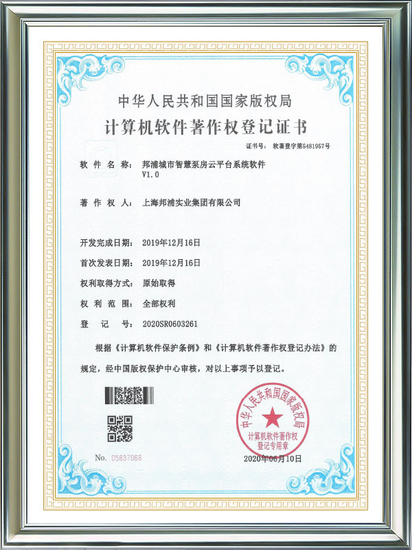 Certificat de înregistrare a lucrărilor de software de calculator Bangpu City Smart Pump Room Platformă Cloud Software de sistem V1.0